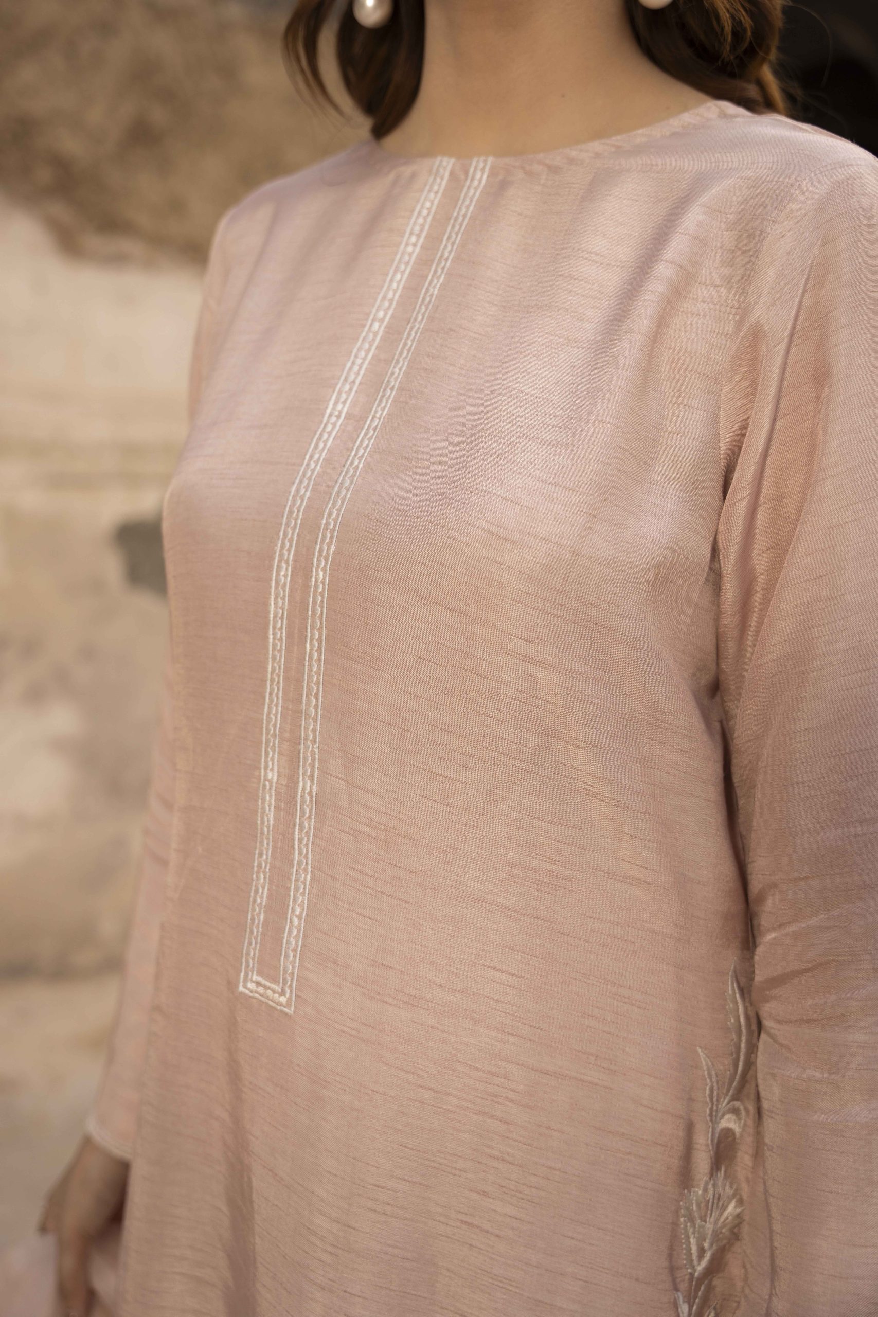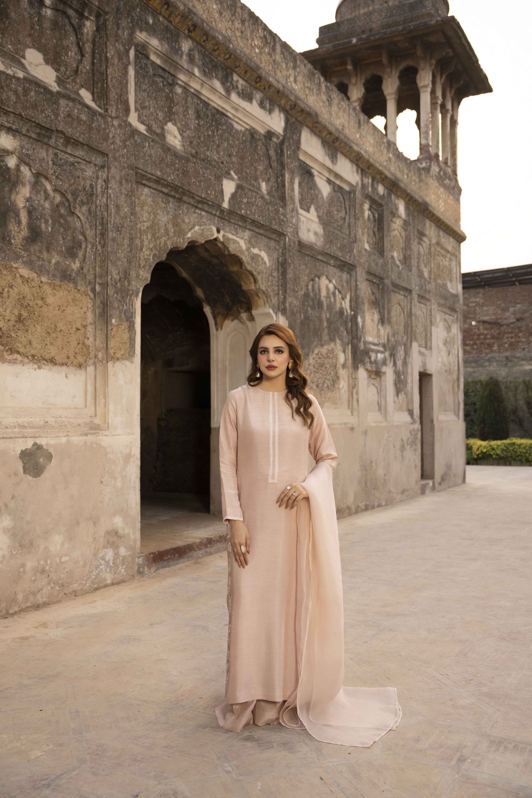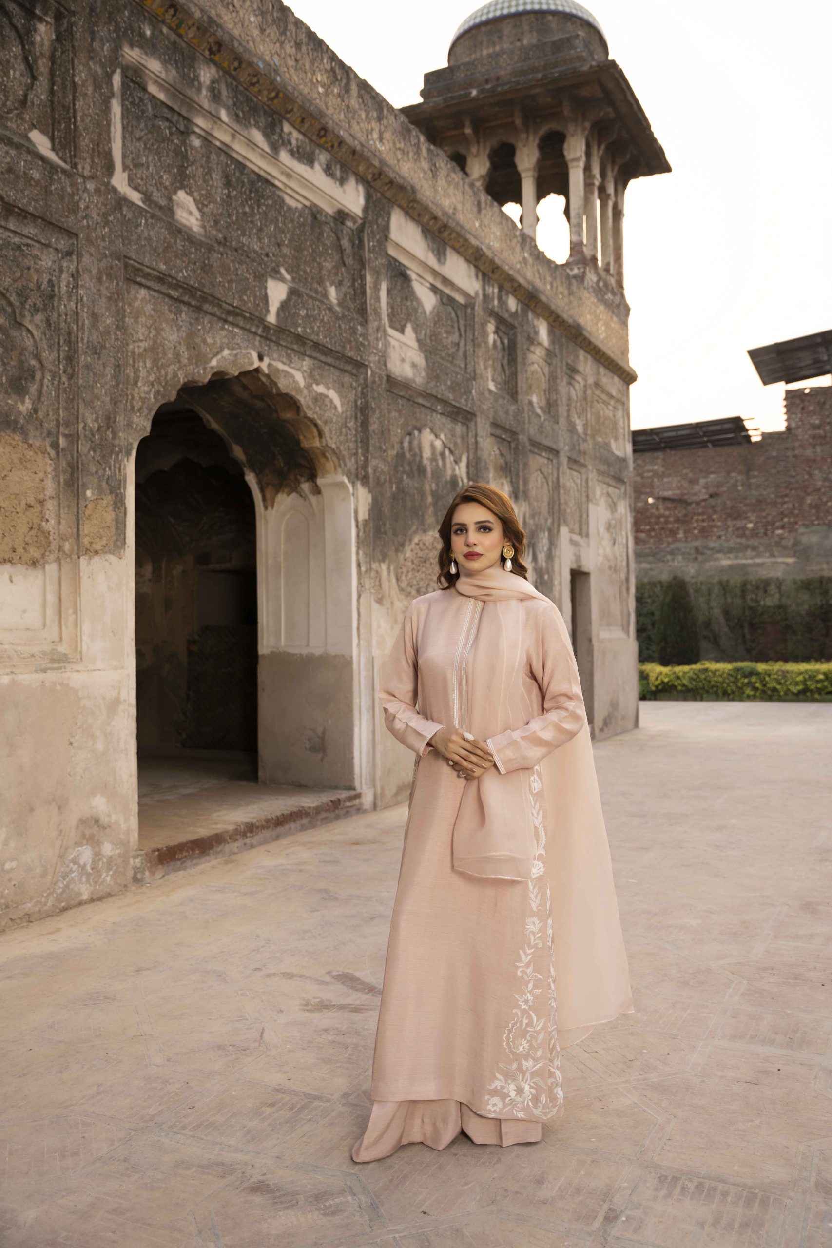 A vision of understated grace — Blush Reverie is crafted from luxurious Korean raw silk, delicately embroidered to create a poetic harmony of texture and tone. Paired with a sheer organza dupatta, this ensemble captures the essence of femininity and timeless sophistication. Its blush hue whispers serenity and charm, perfect for daytime festivities or refined evening affairs.
